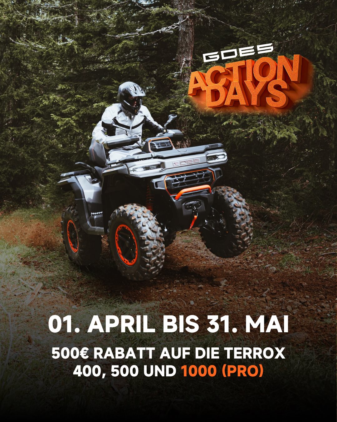 Vom 01.04.2026 - 31.05.2026 ein bei uns sofort verfügbares GOES ATV aussuchen und 500€ sparen! Klingt nach einem Deal? Dann schau direkt nach, ob wir dein Wunschfahrzeug an Lager haben. Die Stückzahlen sind begrenzt.