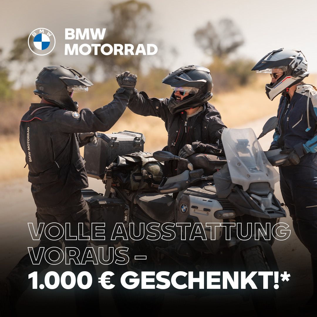 👀 Wichtige Info (aka "das Kleingedruckte"): Die Aktion gilt nur für im ausgewiesenen Zeitraum geschlossene Kaufverträge und ist nicht mit anderen Verkaufsförderungen kombinierbar. Gültig nur für Fahrzeuge des Modelljahres 2025 (oder älter). Eine rückwirkende Geltendmachung, ist generell ausgeschlossen. Zulassung und Übernahme bis spätestens 30.06.26. Es gelten die Aktionsbedinungen von BMW Motorrad und die entsprechenden Stichtage. Werden die Bedingungen nicht erfüllt, entfällt der Vorteil ersatzlos. Ein Rechtsanspruch besteht nicht. Ausgenommen BMW C400X, C400GT, F900R/A2, CE02AM. Druckfehler, Irrtümer und Änderungen vorbehalten. Nur solange der Vorrat reicht.